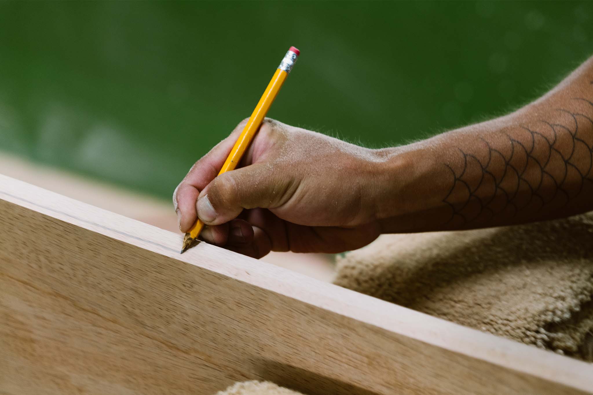 In the process, he went to visit master woodworker Eric Bello at his millwork shop in Wahiawā. In that first meeting, he spotted an albizia surfboard behind Bello. “I felt like I was in the right place,” Valenti says. For years, though, his attention was diverted by his architecture thesis project, and with Bello’s help, he set to work on “Lika,” a proof of concept for albizia as a building material. When the arched wooden structure resembling the Waikīkī Shell was completed in 2018 and displayed on the front lawn of UH Mānoa, demand for Valenti’s work immediately grew. High-profile clients like the Patagonia store at Ward and 1 Hotel in Princeville tapped him to design albizia elements for their properties. “And then, at some point,” he says, “I just started chipping away at the surfboard idea on the side, very covertly.”