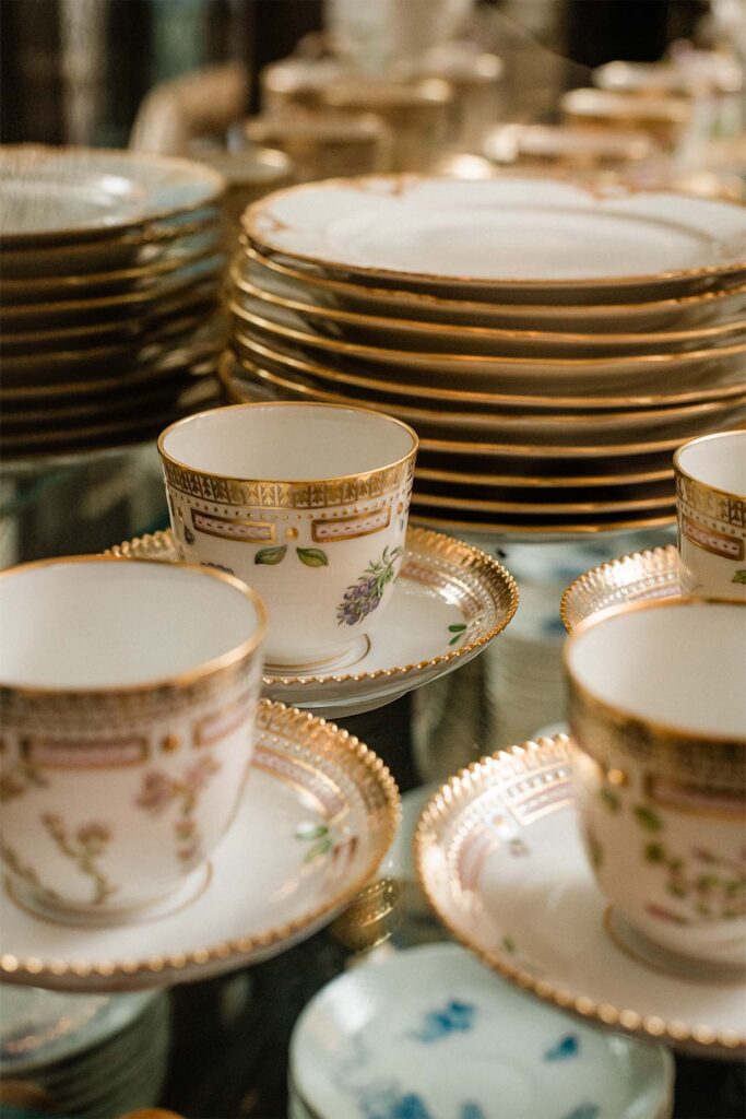 Elsewhere, a pair of wooden vitrines, richly lacquered and hand-gilded, stand sentinel in the hallway. An arched cornice accents the taller of the two, emulating the grace of a temple pagoda. Inside rests Iseki’s collection of fine china and crystal, lovingly amassed through the years. One full porcelain service bears hand-painted botanical drawings, an intricate design instantly recognizable as Flora Danica. The pattern, conceived by Royal Copenhagen in 1803 for a Danish king, remains among the most coveted in the world.