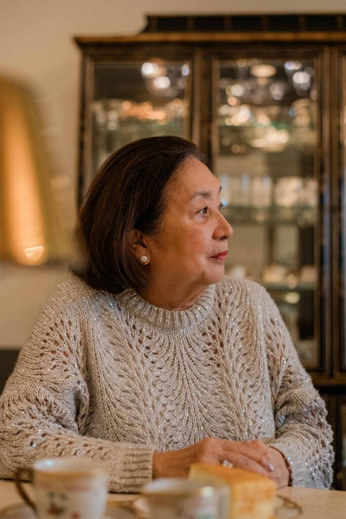 Like the room around her, Iseki is the picture of elegance. She takes the velvet chair across from me, dressed in a matching Brunello Cucinelli knit sweater and linen trousers, her bob styled in a polished coiffe. As Iseki moves, the lurex threads in her cashmere ensemble catch the light, giving her a subtle, radiant sheen.