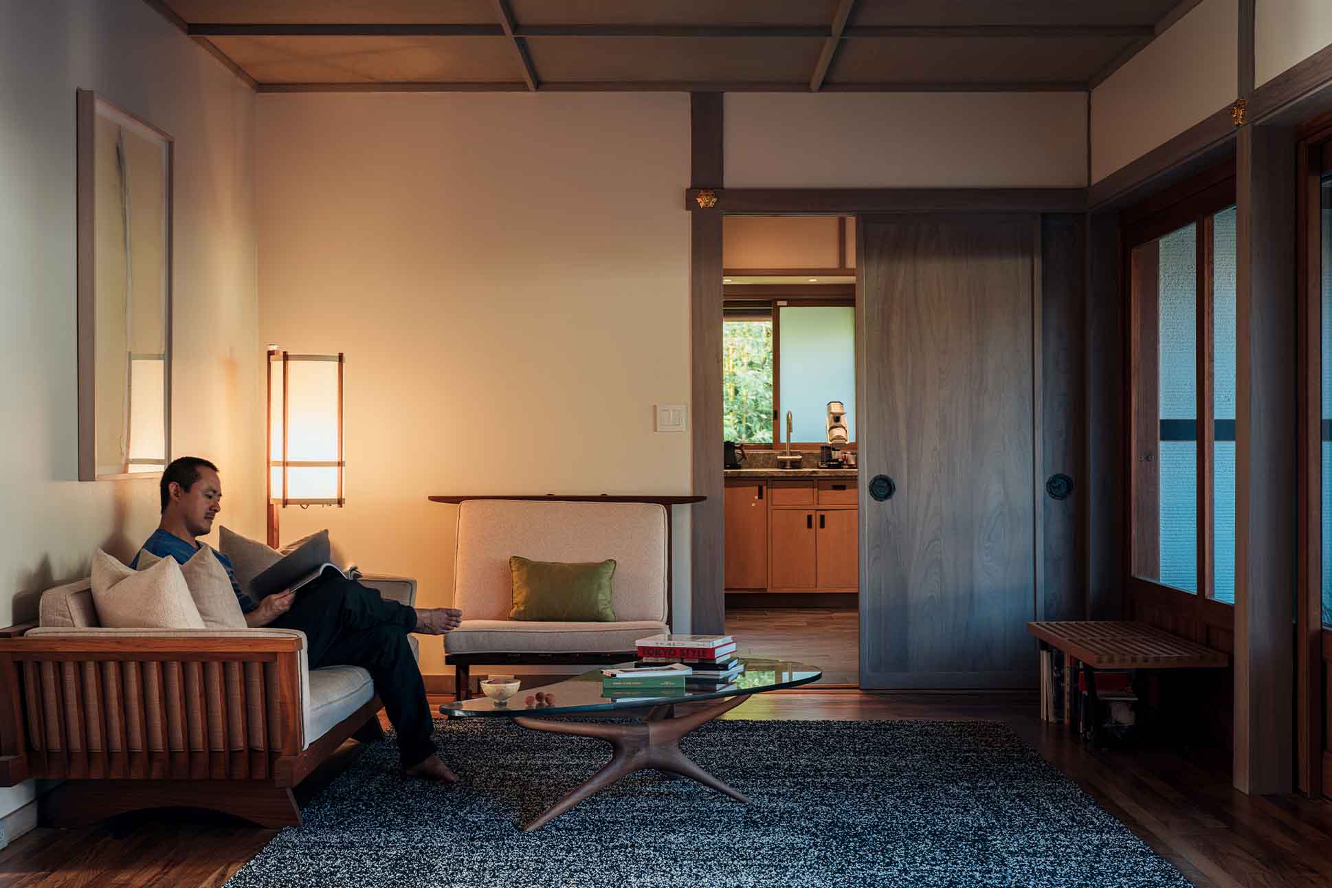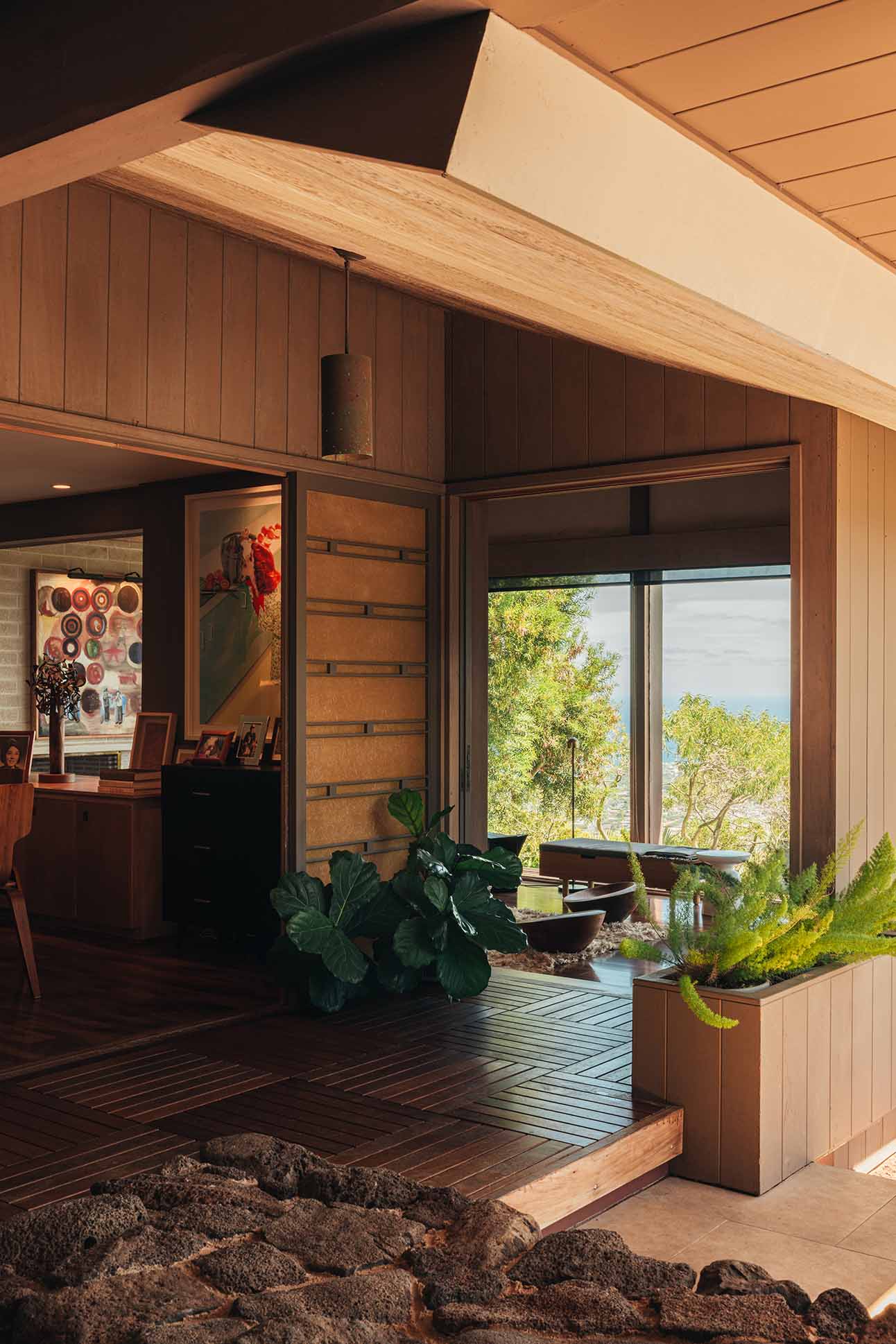 Twelve years after completing the renovation, Sueda still finds himself learning from Ossipoff. He once considered removing a wall to expand the living room view, until he realized they housed pocket doors. “When we experienced the first Kona windstorm, I understood why they were designed that way,” he says. “He cleverly placed all the venting windows east and west so the air could flow through the room but not endanger the interior from inclement weather. These kinds of things shaped my views on architecture.”
