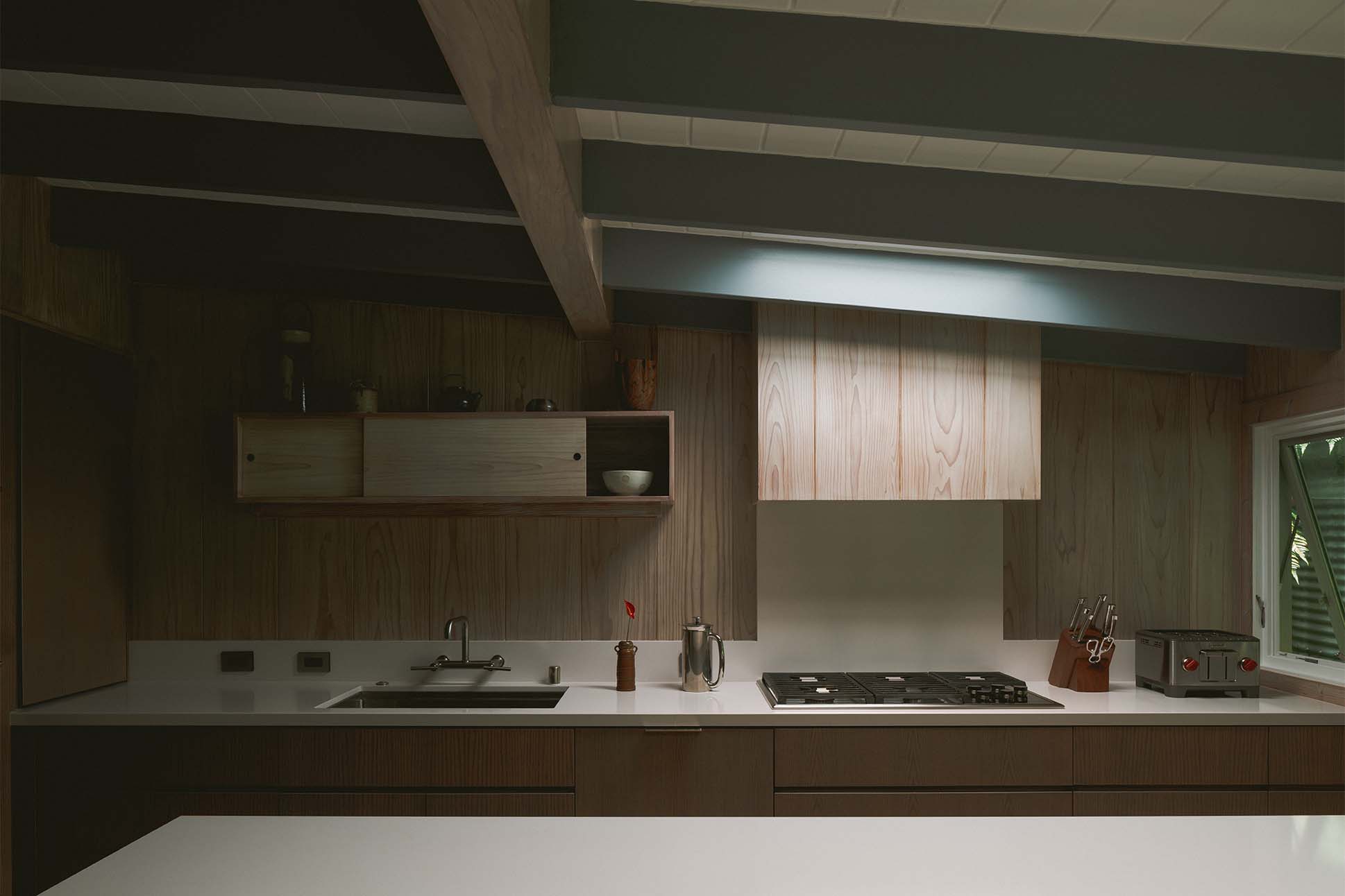 Architect Graham Hart, co-founder of Kokomo Studio, also understands the power of restraint. Along with his business partner, Brandon Large, Hart took on the renovation of a midcentury residence for homeowner clients Taea Takagi-Jones and Grant Jones in 2022, completing the project in 2024. Built along Tantalus, a winding neighborhood along the Ko‘olau’s slopes, the home was designed by Philip Fisk, another important but lesser-known architect from Hawai‘i’s postwar boom. Fisk’s homes were clean and clever, marked by fixed grids, honest geometry, and a precise logic in materials. Yet, time hadn’t been kind to the Forest Ridge bungalow. The kitchen had been haphazardly expanded, its layout confused by decades of ad hoc remodeling.