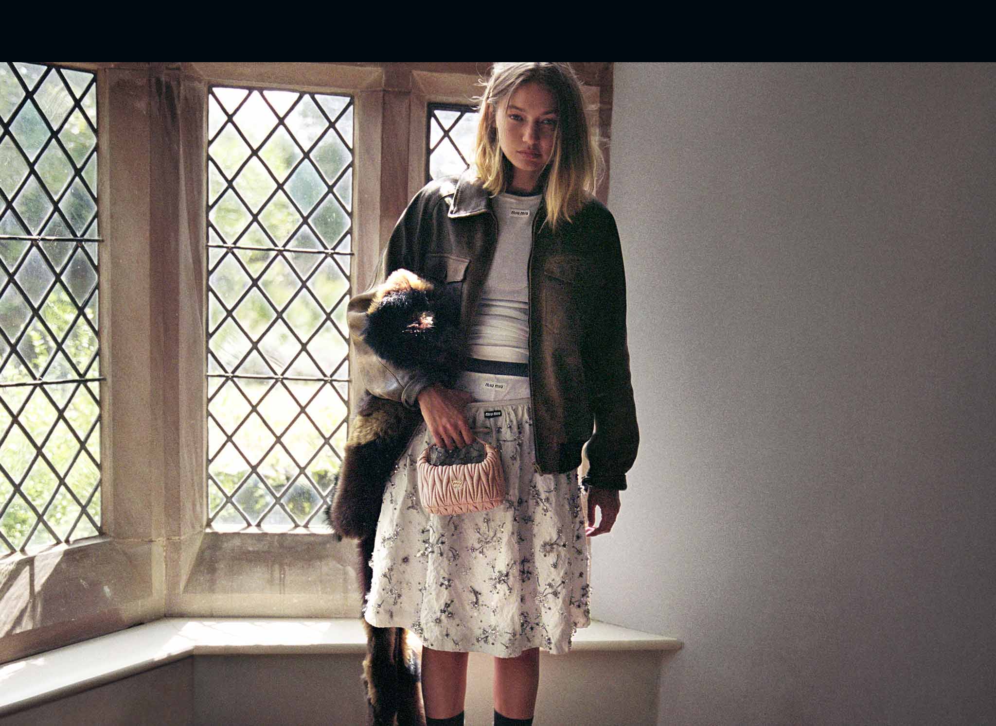 Within the weathered mansion walls, time’s unflinching momentum is juxtaposed with delicate, graceful attire that radiates beauty, hope, and wonder. Each Miu Miu design—the suede wraparound skirt, the embroidered cashmere cardigan—is artfully amplified through vintage touches and artisanal craftsmanship. Edgy layering brings an air of rebellion to the party: A waxed suede leather jacket atop an embroidered duchesse skirt and leather loafers. A shearling patchwork caban jacket over a classic ribbed jersey tank top.